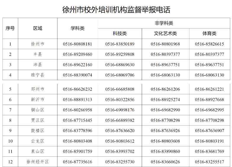 为深入贯彻落实中央“双减”工作决策部署,全面完成“双减”三年目标任务,进一步发动社会各界共同参与校外培训机构治理工作,持续规范校外培训机构行为,现将省、设区市、县(市、区)各级各类校外培训机构违法违规开展培训的监督举报电话向社会公告。