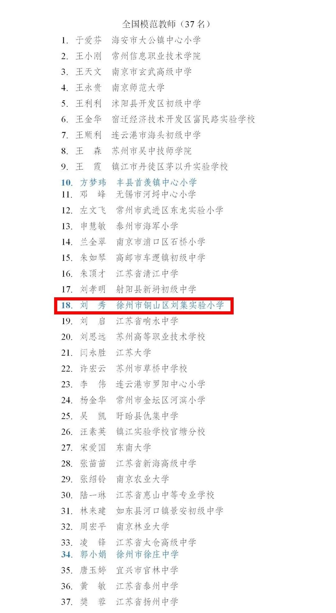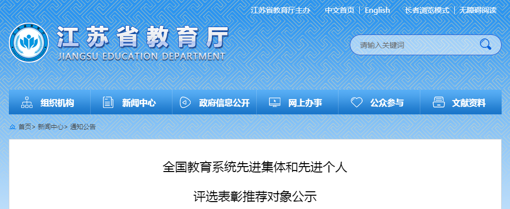 根据《人力资源社会保障部 教育部关于开展2024年全国教育系统先进集体和先进个人评选表彰的通知》(人社部函〔2024〕64号)精神,江苏省人力资源和社会保障厅、江苏省教育厅联合成立全省教育系统先进集体和先进个人评选推荐工作领导小组,组织开展了我省表彰对象推荐工作。经各地、各校推荐、省评选推荐工作领导小组评审、全国教育系统评选表彰工作领导小组评审,现将江苏省全国教育系统先进集体、全国模范教师、全国优秀教师和全国教育系统先进工作者、全国优秀教育工作者推荐对象予以公示。公示时间为2024年8月5日至9日。
