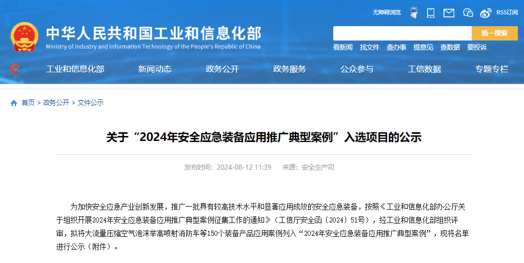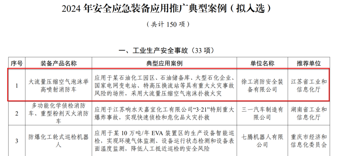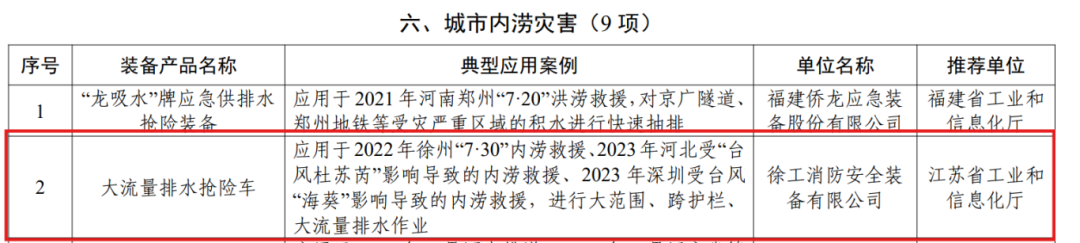徐工消防安全装备有限公司入围2个2024年安全应急装备应用推广典型案例。大流量压缩空气泡沫举高喷射消防车,应用于石油化工园区、石油储备库、大型石化企业、国家电网变电站、特高压换流站等具有重大火灾事故风险的场所,采用大流量压缩空气泡沫扑救火灾;大流量排水抢险车应用于2022年徐州“7·30”内涝救援、2023年深圳受台风“海葵”影响导致的内涝救援等,进行大范围、跨护栏、大流量排水作业。