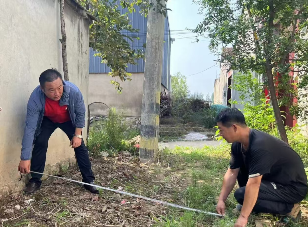 8月15日,姜站村党支部负责人崔福红带领村干部、党员志愿者对村内破损路段进行测量放线,做好损坏道路修缮的前期准备工作。