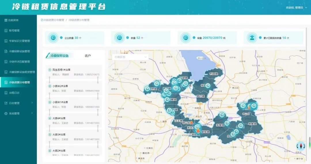 数字化服务平台利用大数据、物联网、云计算、地理信息系统等技术,把各方连接在一起。铜山区农业农村局互联网中心主任王松介绍,该平台绘制出“冷链资源总览一张图”“冷藏车辆一张图”“冷库租赁一张图”“市场价格一张图”,实现冷藏储运资源精准匹配,有效解决了冷库吸储不足、商户冷库租赁难、农产品存储损耗大等难题,既稳定了市场供应,也提升了抗风险能力。
