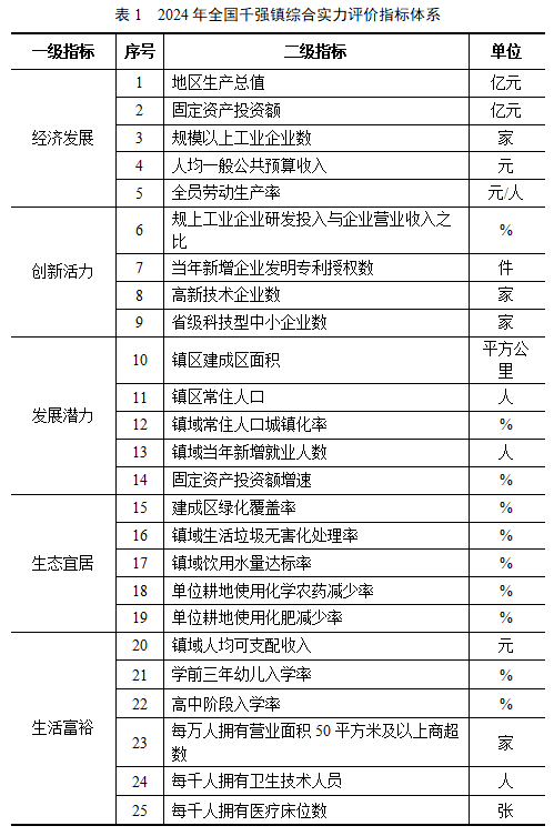 2024年“全国综合实力千强镇”由中国中小城市发展指数研究课题组和国信中小城市指数研究院发布,报告的研究对象为全国重点镇、各省份发展态势较好的建制镇,以经济发展、创新活力、发展潜力、生态宜居、生活富裕五个一级指标25个二级指标作为评价标准。