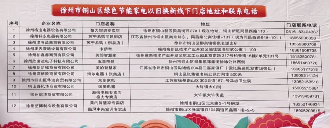 据了解,铜山区绿色节能家电以旧换新活动集结了徐州格逸电器设备有限公司、徐州科永电器有限公司、徐州津鸣源商贸有限公司等12家铜山家电销售企业的14家门店,涉及空调、洗衣机、冰箱等8类国家补贴家电和9类江苏补贴家电商品,让消费者在“家门口”就能享受一站式以旧换新消费补贴,推动铜山消费市场持续升温。