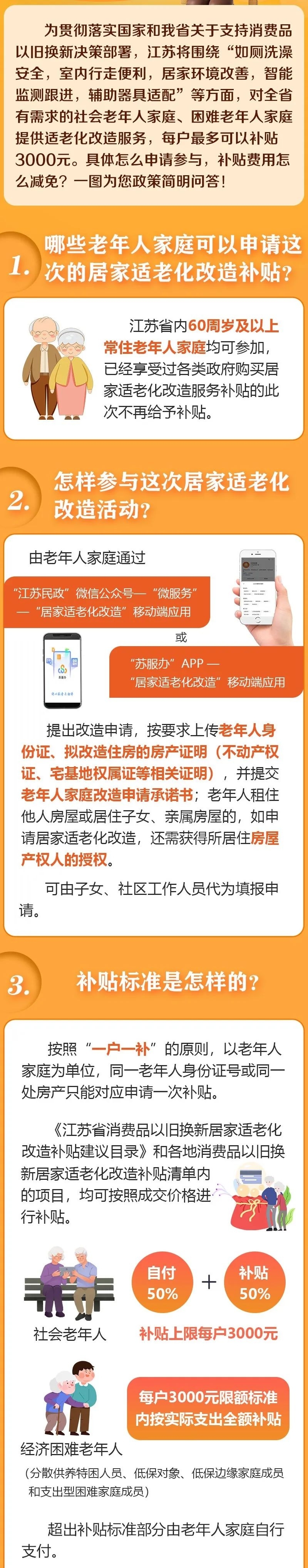 此次居家适老化改造补贴对象大范围扩面,凡本市常住60周岁及以上老年人家庭均可申请,每户最高可享受3000元补贴。(如补贴资金额度提前使用完毕,则根据申请先后顺序进行补贴。)