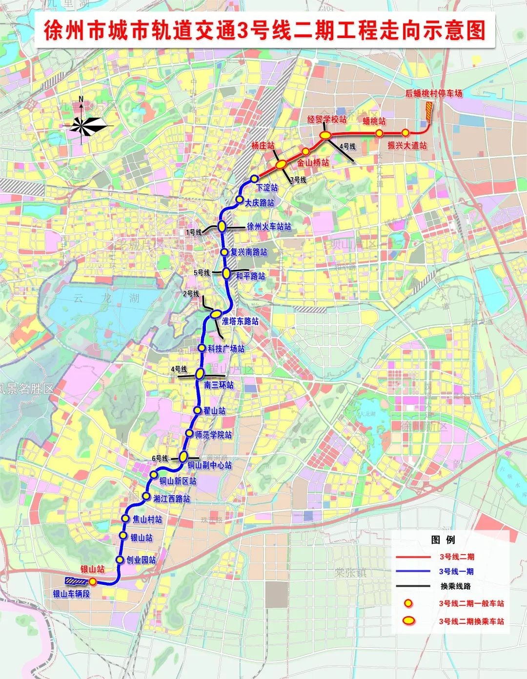 据悉,徐州地铁3号线二期工程全长6.56公里,分为南北两段,共设6座车站,北段设站5座,分别是振兴大道站、蟠桃站、经贸学校站、金山桥站、杨庄站,线路东起于振兴大道站,途经驮篮山路、蟠桃山路、下淀路接至3号线一期工程起点站下淀站;南段设站1座,线路利用既有银山车辆段出入线运营,在车辆段东侧设置一座高架站银山站。
