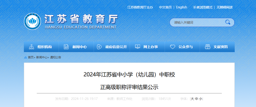 2024年11月23-24日,经江苏省中小学正高级教师高级专业技术资格评审委员会评审,通过曹海永等480位同志中小学(幼儿园)正高级教师任职资格。经江苏省中等职业学校教师正高级专业技术资格评审委员会评审,通过杨永和等35位同志中等职业学校正高级讲师任职资格。
