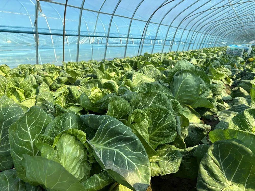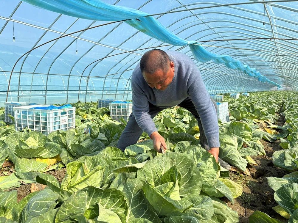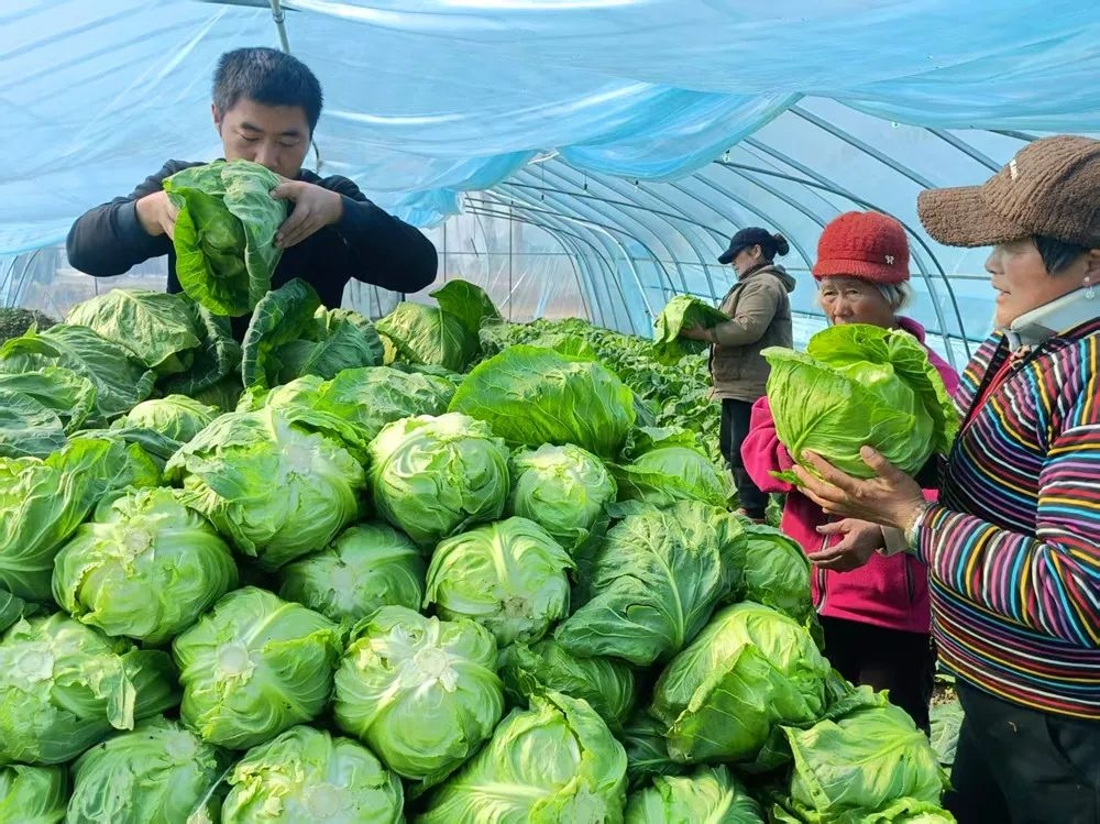 王庆芳是一位“老菜农”,种植经验丰富,从种植到收获,每个环节他都会严格把控,确保蔬菜品质。今天是第一天采收甘蓝,王庆芳很是忙碌:“我们每棵菜重量达到两斤半到三斤,亩产1万斤左右,可以采收半个月,菜口感脆甜,深受市场欢迎,每天都有客户订购,日销售一万多斤。按照现在的市场行情,每亩收入2万元。”