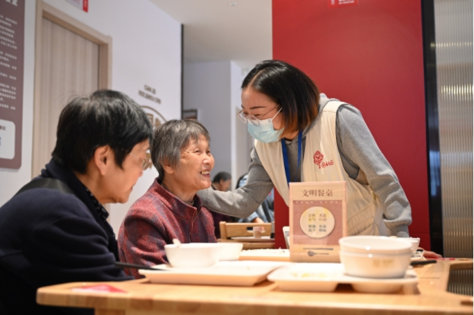 2023年11月16日,社区工作人员在福州市鼓楼区庆城社区长者食堂内与用餐老人交流。新华社记者 姜克红 摄