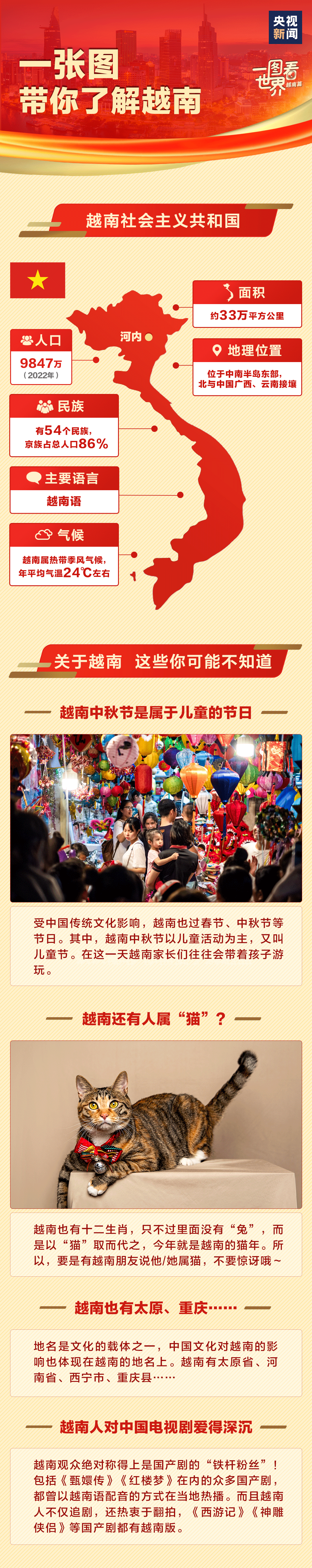 关于越南,你知道多少?越南有与中国几乎一致的十二生肖,但越南十二生肖里没有“兔”,而有“猫”。今年就是越南的猫年。此外,越南人还十分爱看中国电视剧。今天,跟着央视新闻《一图看世界·越南篇》,来了解更多↓↓↓