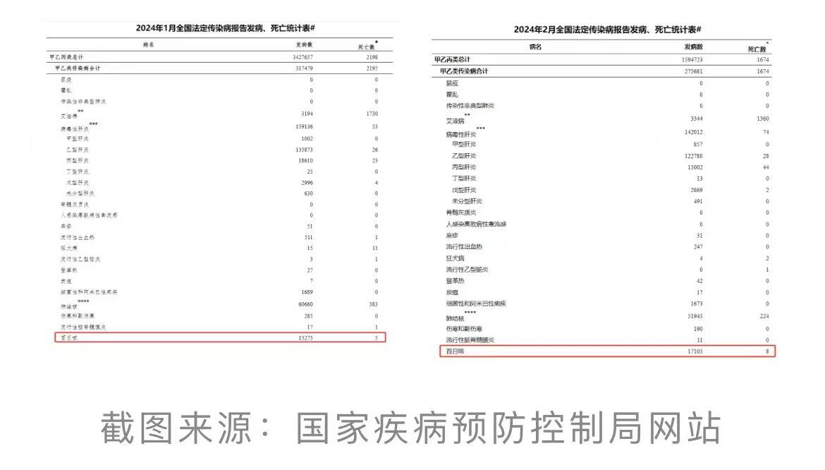 据国家疾控局官网定期发布的“全国法定传染病疫情概况”,2024年1月1日-2月29日,全国报告百日咳32380例,是2023年同期(1421例)的近23倍。其中,1月死亡人数为5人,2月死亡人数为8人。
