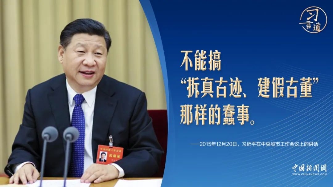 2013年12月,习近平在中央城镇化工作会议上指出,“我们的城市有许多历史记忆,特别是一些历史悠久的老城区,是最宝贵的东西,不能因为浮躁、无知而破坏掉”。