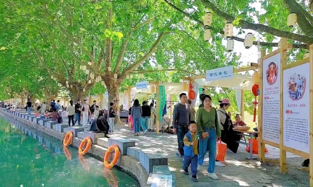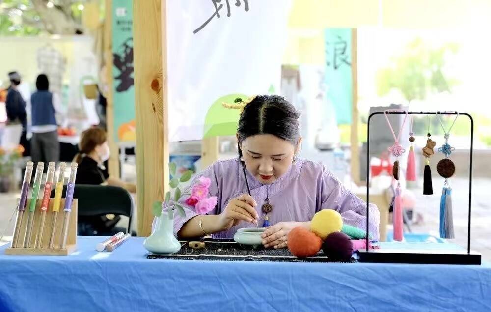沿着湖水走了一段,在草坪的一旁,我想这里必定是一个令孩子们欢喜的地方——非遗集市。集市中草编、香包、陶艺、侯氏毛笔……等等非遗文化数不胜数,向远方来的客人们展现着大铜山文化之美。在柔和的阳光下,小摊焕发着荣光,无处不彰显着汉文化的魅力。