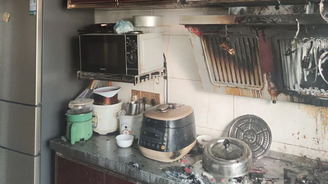 2024年5月14日,江苏泰州市海陵区一居民家中着火,经询问得知户主在厨房做饭,出门时忘记关闭厨房灶台,锅被烧干后引燃油烟机上的油垢,最终引发火灾。