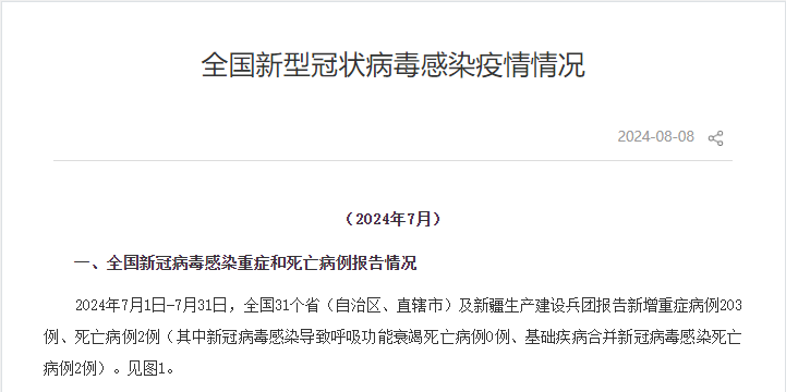 2024年7月1日-7月31日,全国31个省(自治区、直辖市)及新疆生产建设兵团报告新增重症病例203例、死亡病例2例(其中新冠病毒感染导致呼吸功能衰竭死亡病例0例、基础疾病合并新冠病毒感染死亡病例2例)。