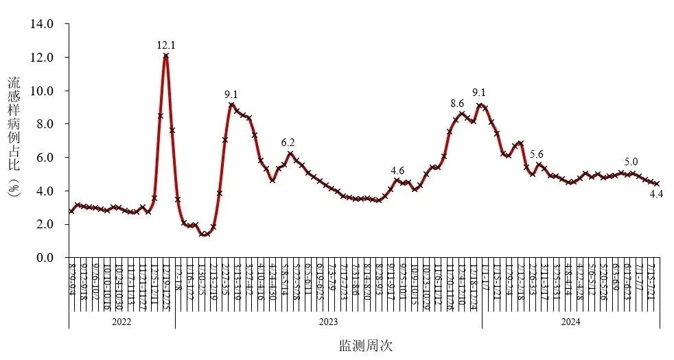 2024年第27周(7月1日-7月7日)至第30周(7月22日-7月28日),全国哨点医院流感样病例占门(急)诊就诊人数比例小幅下降,流感样病例占比分别为4.9%、4.7%、4.5%、4.4%。