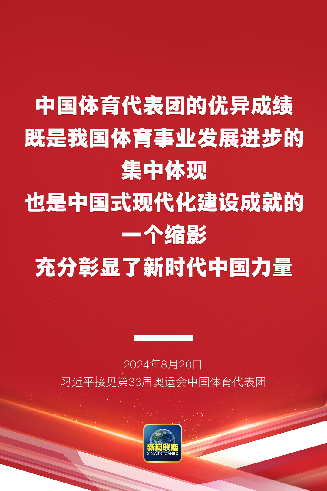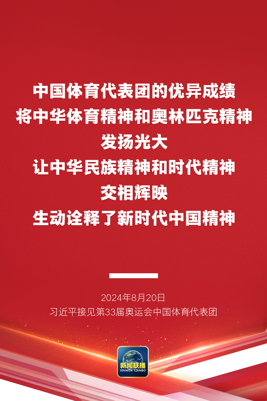 习近平指出,中国体育代表团的优异成绩,将中华体育精神和奥林匹克精神发扬光大,让中华民族精神和时代精神交相辉映,生动诠释了新时代中国精神。赛场上,大家牢记党和人民重托,“国家荣誉永远超过个人”、“我的这块金牌献给伟大的祖国”等誓言掷地有声,展现了祖国至上、为国争光的赤子情怀,展现了顽强拼搏、自强不息的必胜信念,展现了团结协作、并肩作战的宝贵品质,展现了中国青年一代自信乐观、热情友好的阳光气质。你们让全世界看到了中华优秀传统文化的深厚积淀,看到了中国开放包容、昂扬进取的时代风貌,看到了中国人民的志气、锐气和底气。祖国和人民为你们骄傲,为你们点赞。