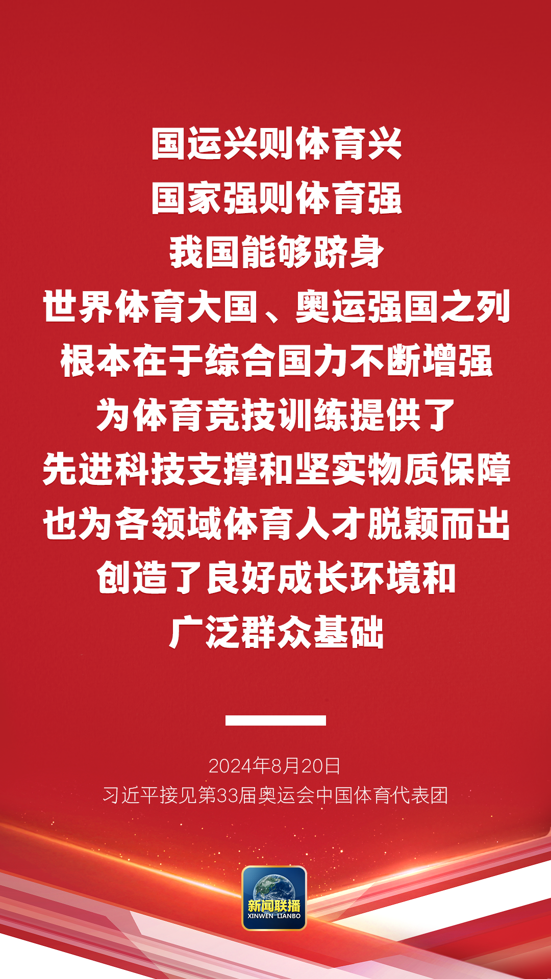 在热烈的掌声中,习近平发表重要讲话。他表示,中国体育代表团的优异成绩,既是我国体育事业发展进步的集中体现,也是中国式现代化建设成就的一个缩影,充分彰显了新时代中国力量。国运兴则体育兴、国家强则体育强。我国能够跻身世界体育大国、奥运强国之列,根本在于综合国力不断增强,为体育竞技训练提供了先进科技支撑和坚实物质保障,也为各领域体育人才脱颖而出创造了良好成长环境和广泛群众基础。新时代新征程,以中国式现代化全面推进强国建设、民族复兴伟业,必将为我国体育事业发展提供更好条件、注入强劲动力。我们要继续大力发展以人民为中心的体育事业,推动全民健身和全民健康深度融合,向着建设体育强国、健康中国的目标不断迈进。