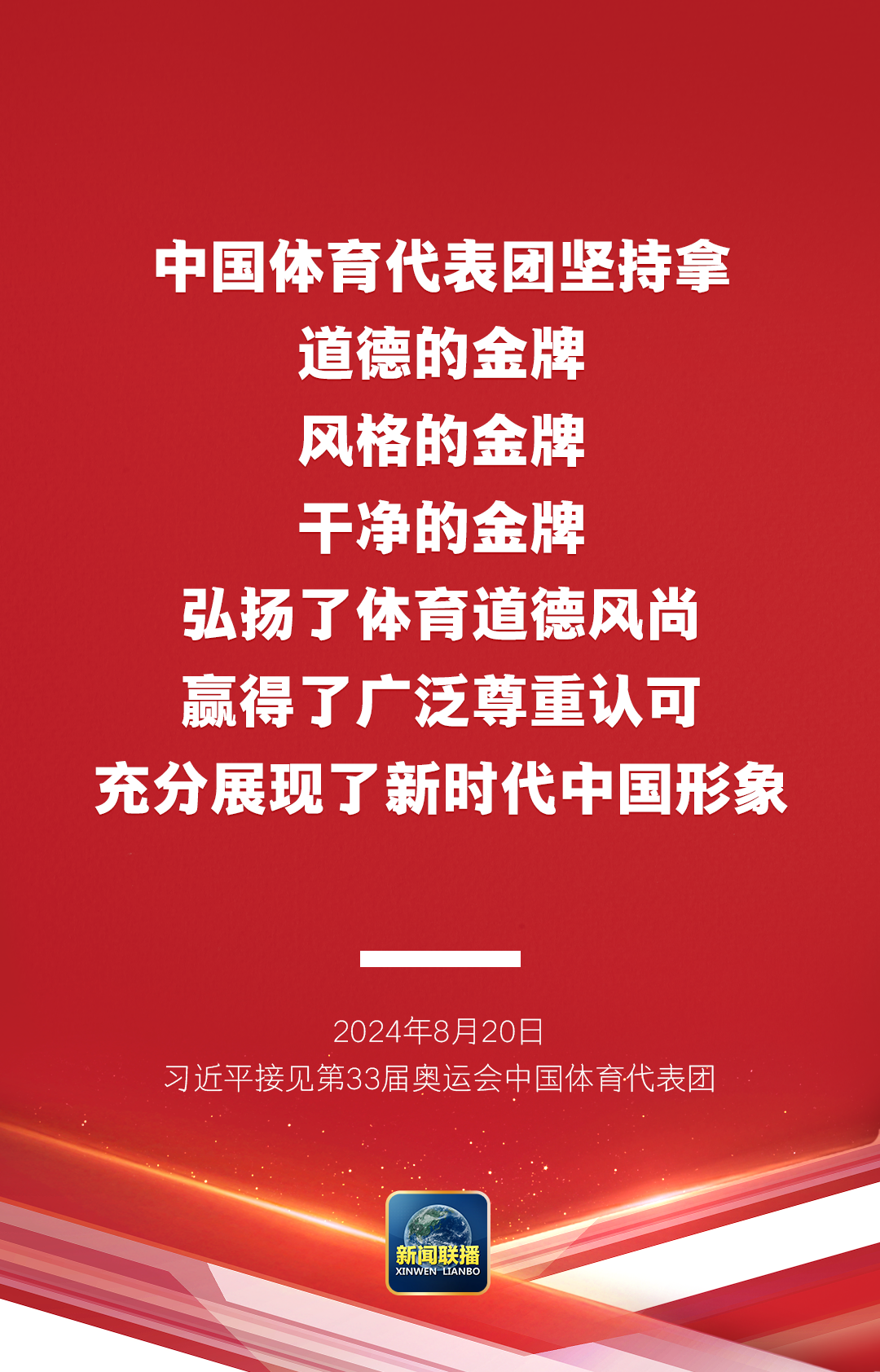 习近平强调,中国体育代表团坚持拿道德的金牌、风格的金牌、干净的金牌,弘扬了体育道德风尚,赢得了广泛尊重认可,充分展现了新时代中国形象。赛场上,大家遵守规则、尊重对手、尊重裁判、尊重观众,保持良好的赛风赛纪和文明礼仪,胜不骄、败不馁,在竞技上、道德上、风格上都拿到了金牌。