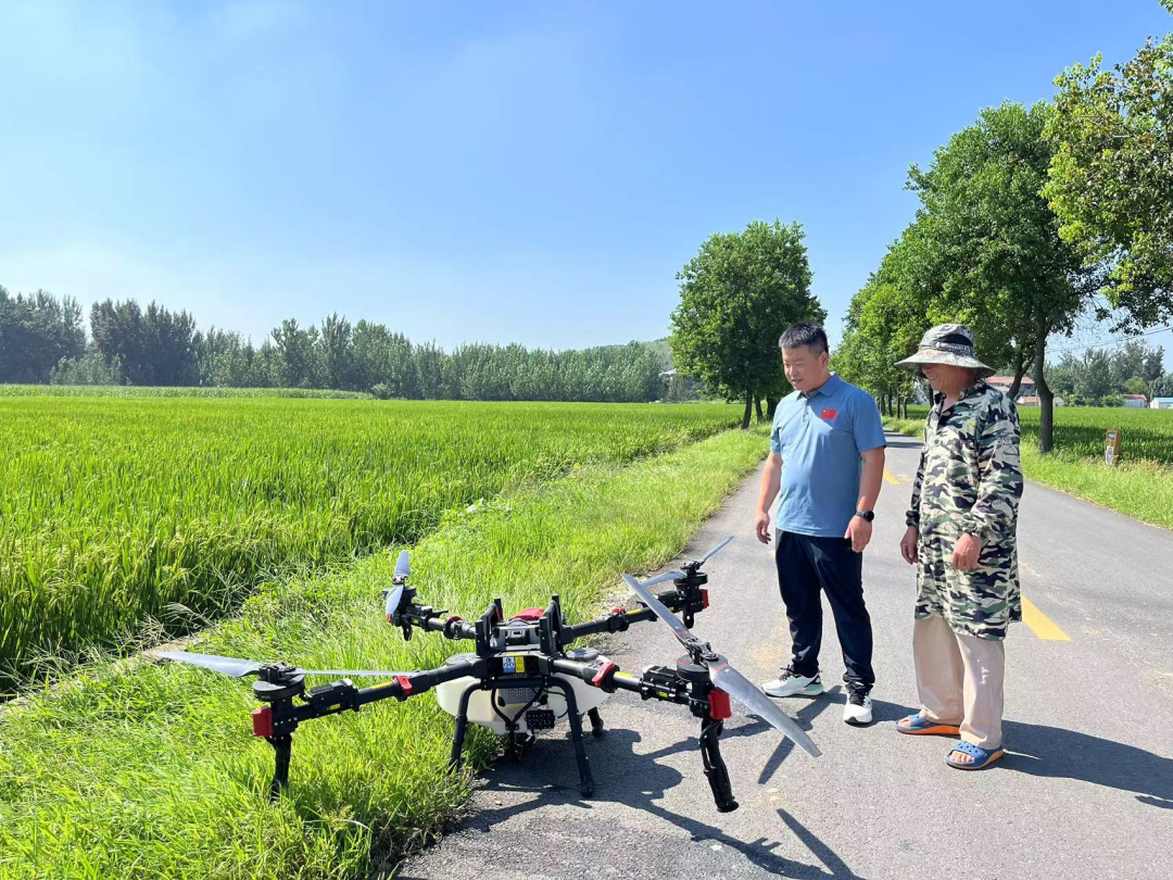 8月26日,西沿村党总支部书记曹亚雷到水稻种植大户地块,查看无人机打药情况,并向种植大户讲解无人机使用注意事项,确保稳产丰收 。