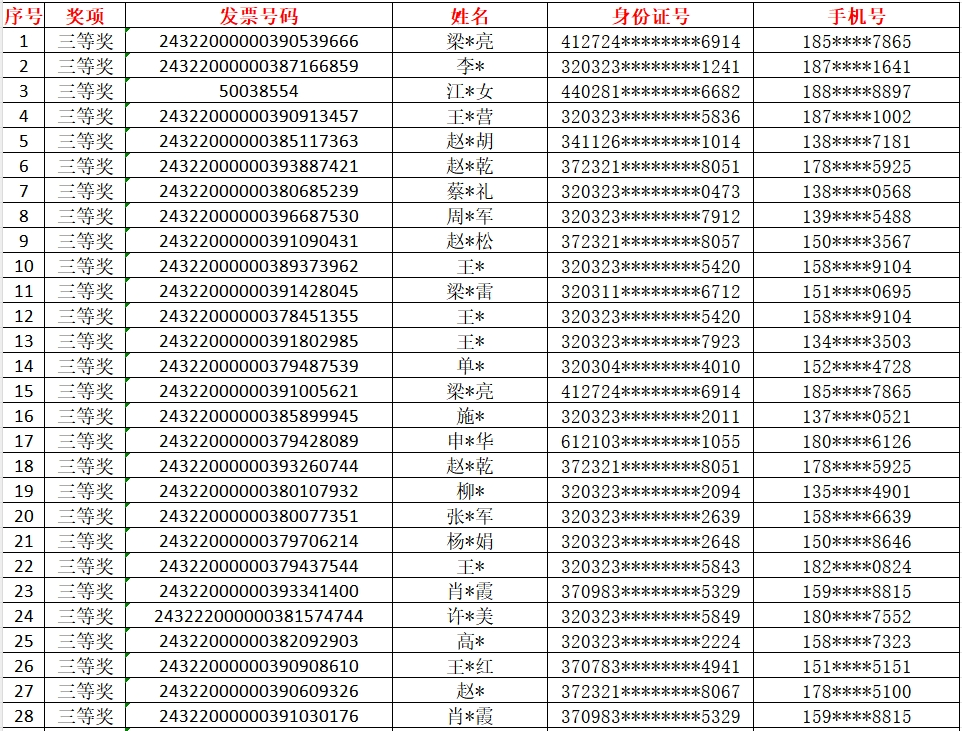2024年9月15日0:00至2024年10月31日24:00,参加活动的消费者将购物发票代码、发票号码、发票金额、姓名、身份证号、手机号在铜心圆APP进行登记;每上传一次发票,获得一次抽奖机会(同张发票不得重复登记)。分别在9月30日、10月16日、11月1日,在铜山公证处监督下进行开奖。