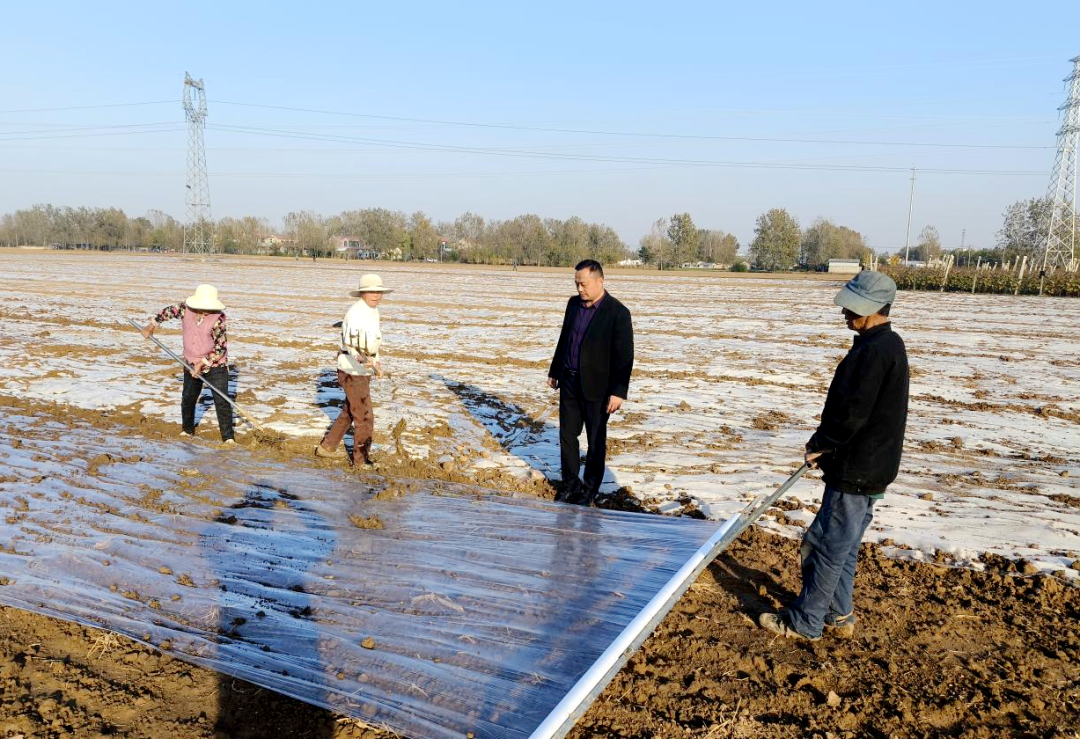 11月5日,詹湖村党支部书记詹龙到村“党建+土地合作社”地块,对已种植的白芷进行覆盖地膜。