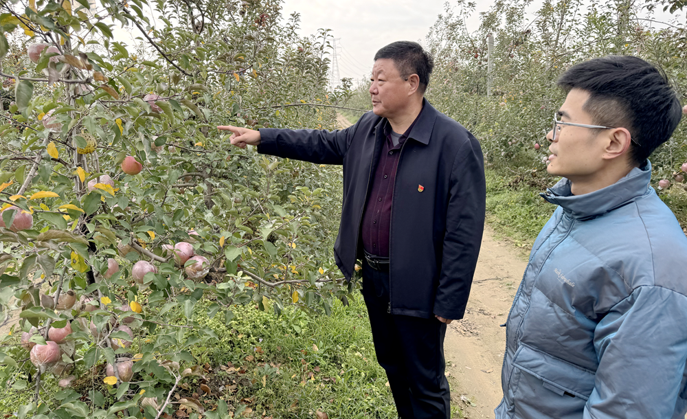 11月20日,沙塘村党支部书记张永光到苹果园查看苹果丰收情况,并帮助果农联系销售渠道,切实为农民增收保驾护航。