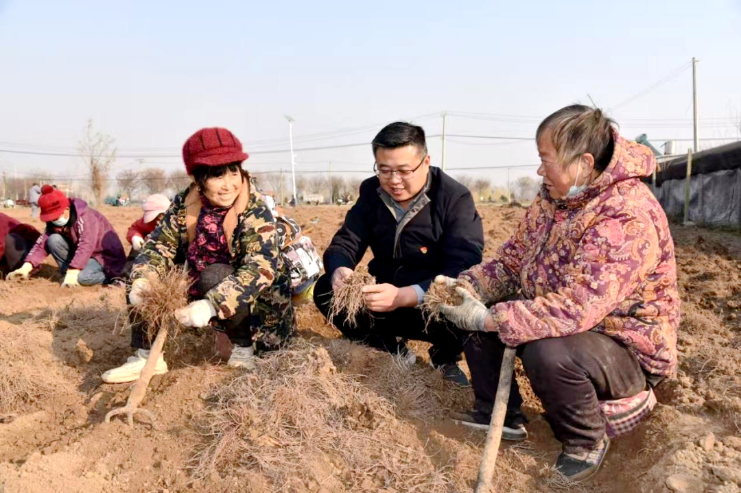 12月15日,周庙村党支部书记王振永组织村民对村中药材种植基地紫菀进行采挖、入土、装袋。