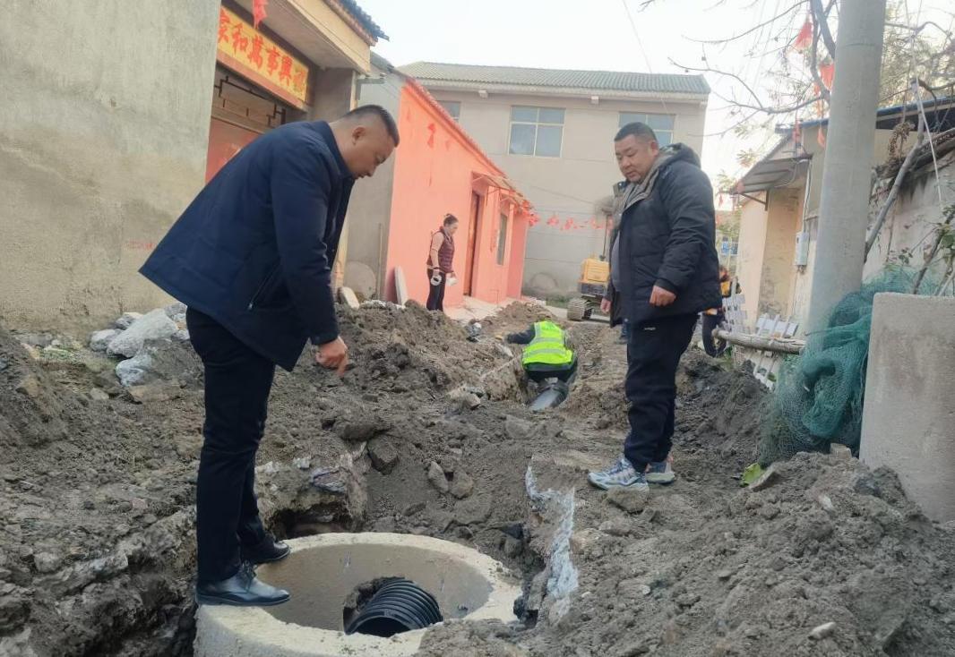 12月11日,牌坊村党支部书记曹继奎带领村干部对牌坊村后刘自然村污水管网建设情况进行巡查,确保项目如期完工。