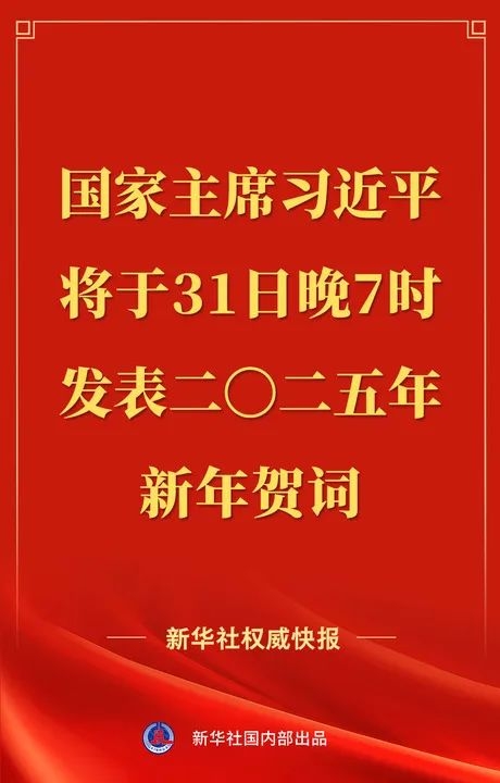 国家主席习近平将于31日晚7时通过中央广播电视总台和互联网,发表二〇二五年新年贺词。