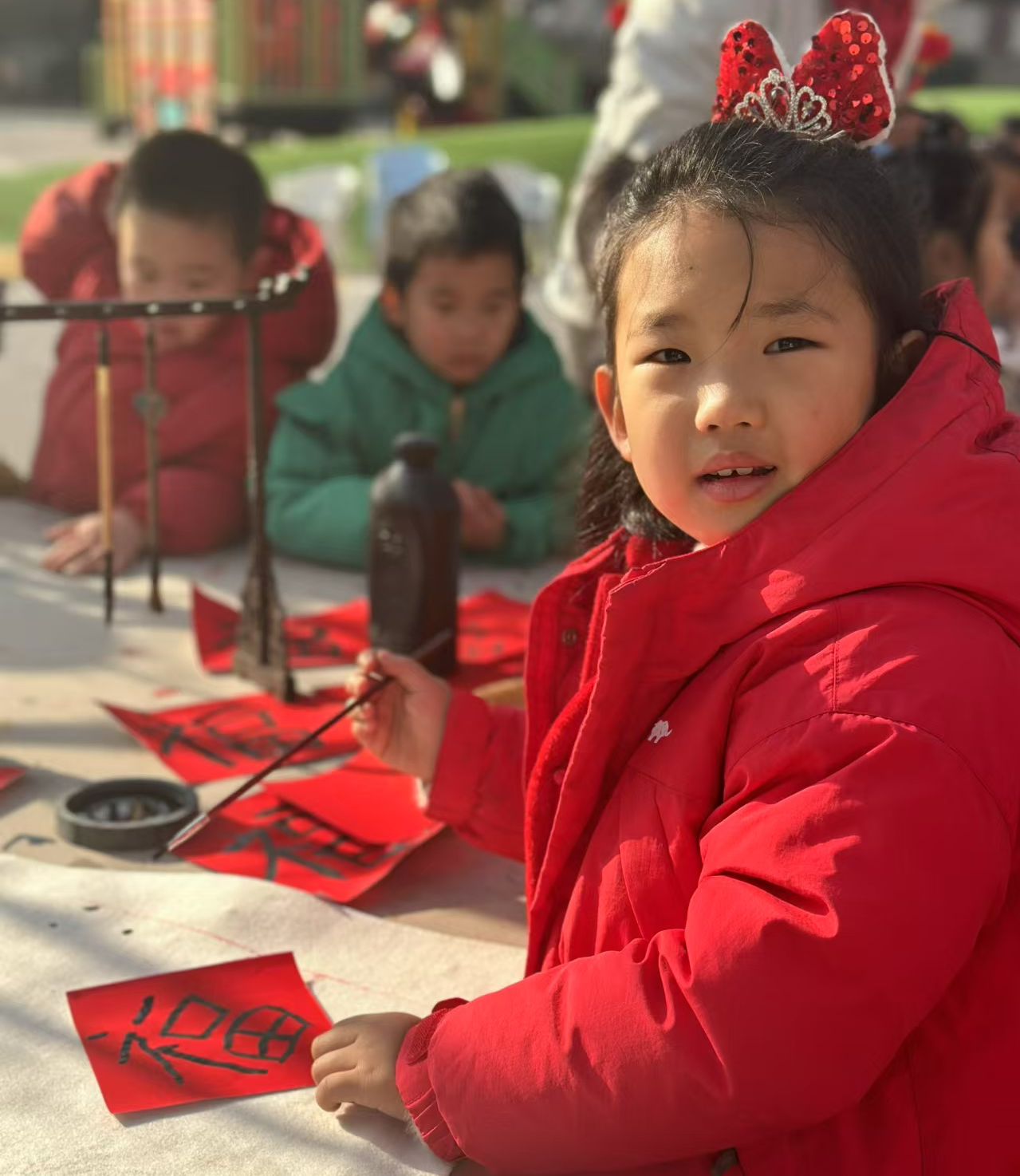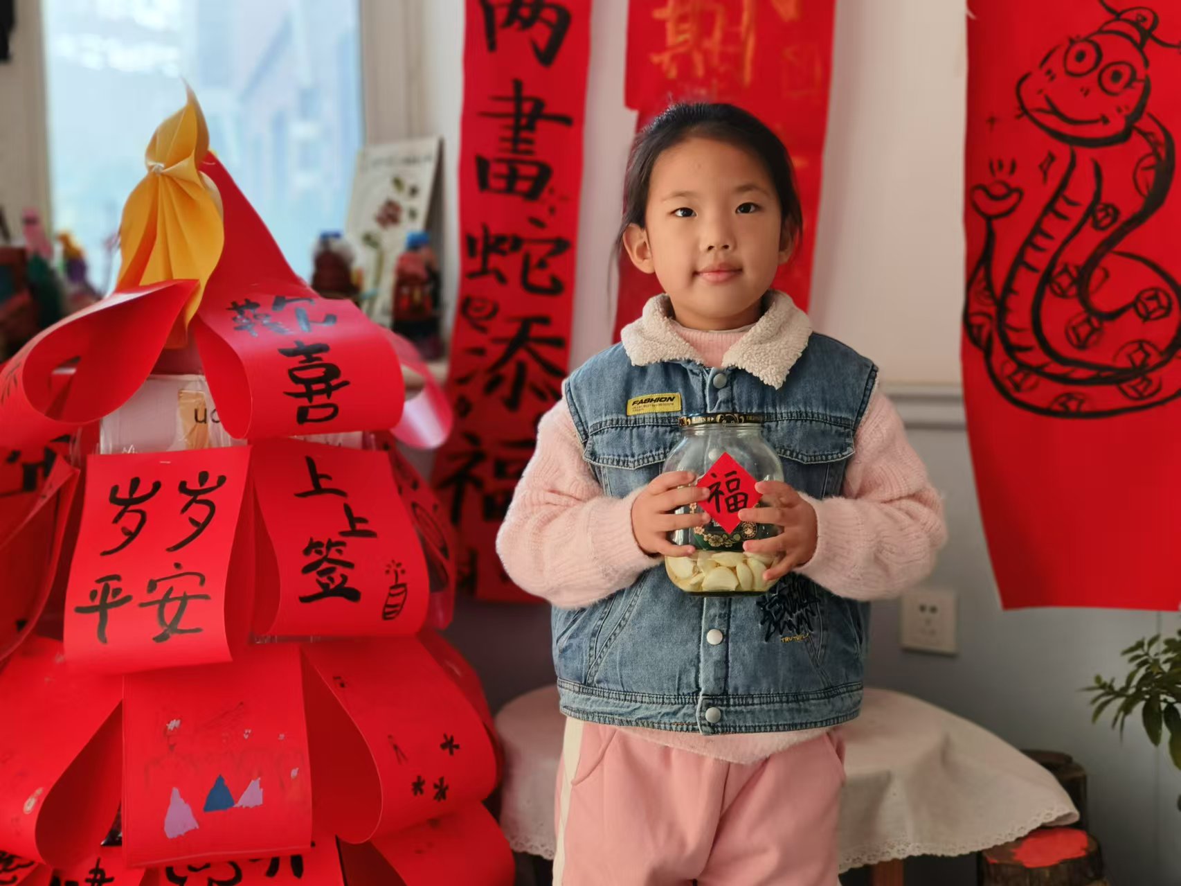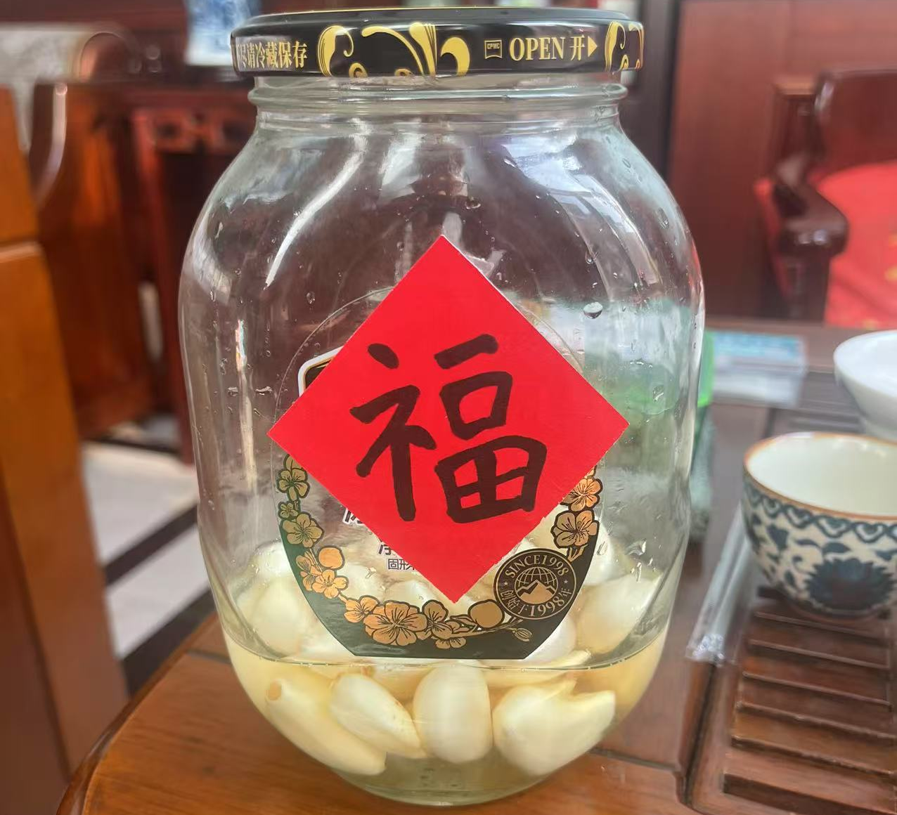 小朋友们不仅亲手制作了美味的腊八蒜,还写下了”福“字,贴在腌制腊八蒜的瓶子上。