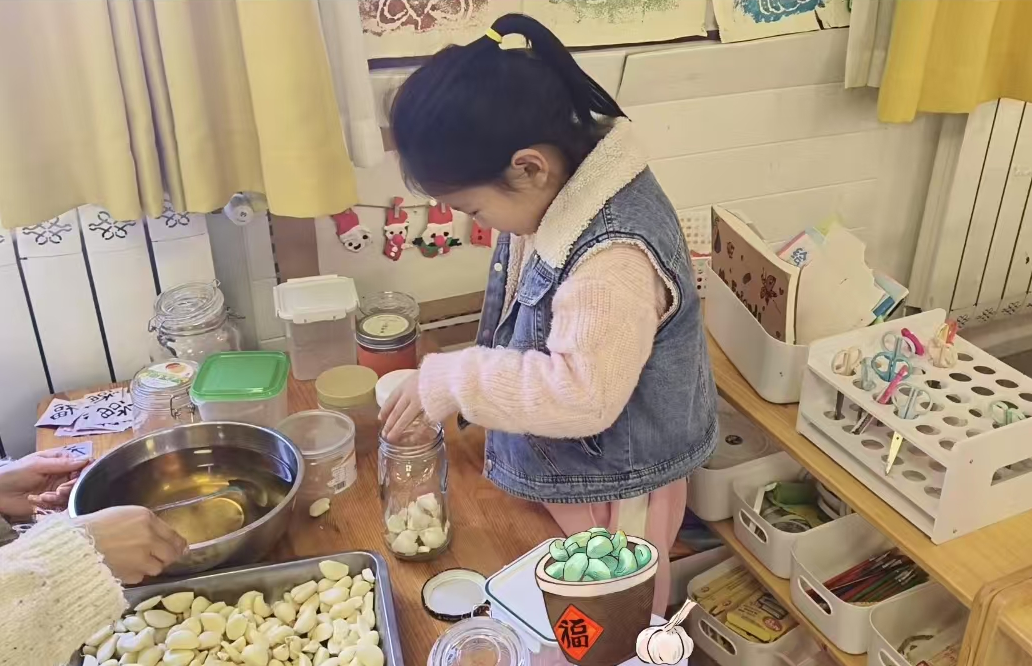 今天是传统的腊八节,我们大(1)班的小朋友们在宋老师的带领下体验了一次特别的活动——学习腌制腊八蒜。