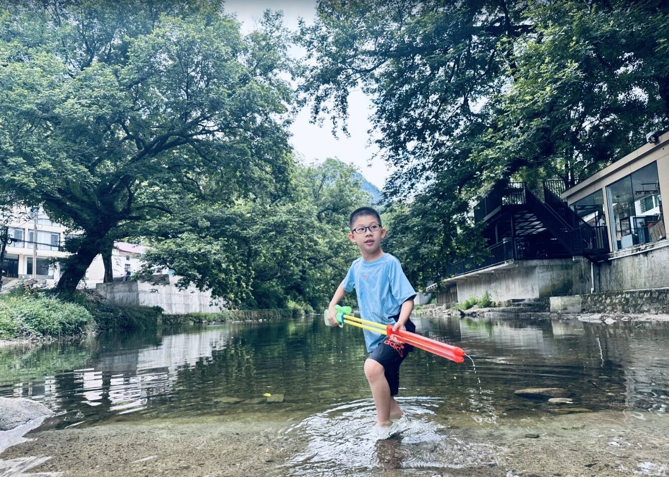 皖南的水蜷曲在绿色的山脚下,弯弯曲曲,淙淙流淌。蓝天、白云、绿树都被倒映在了这清澈的水面上。不时还有小鱼游过,自由自在欢快跳跃。