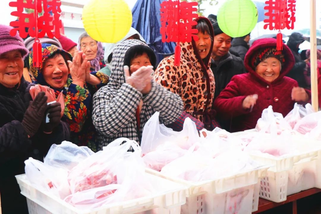 “请大家按照村组顺序到摊位前排队领取猪肉啦,下雨天不要着急,每人5斤,人人都有!”1月24日,拾段村29位爱心人士购置3000斤猪肉,为村内近600名70岁以上老人发放新春福利。