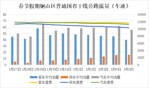春节期间,我区国省干线公路货车车流量下降明显,客车车流量较高。