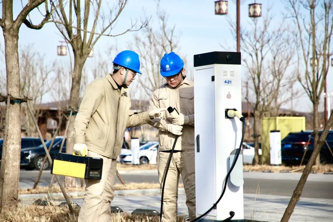 铜山供电公司运维人员到徐州园博园绿色生态停车场检修充电设施,助力春节假期游客安全绿色出行。