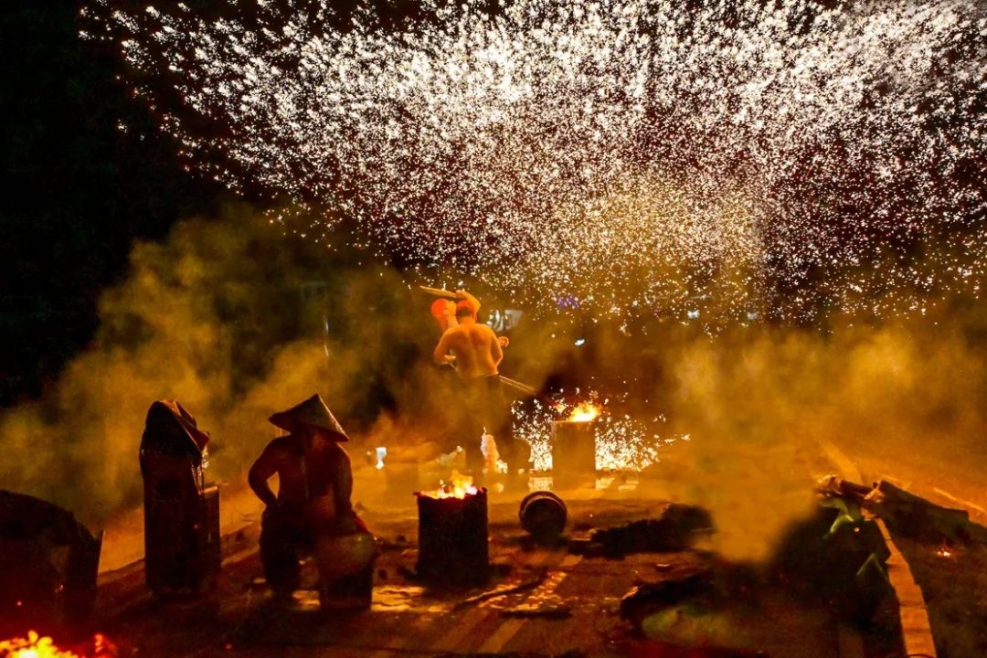 夜幕降临,匠人们挥动铁锤,将高温熔化的铁水击向空中,绽放出万朵火花。火壶表演者手持火壶缓缓入场,熊熊火焰从壶中喷涌而出,瞬间点亮夜空。