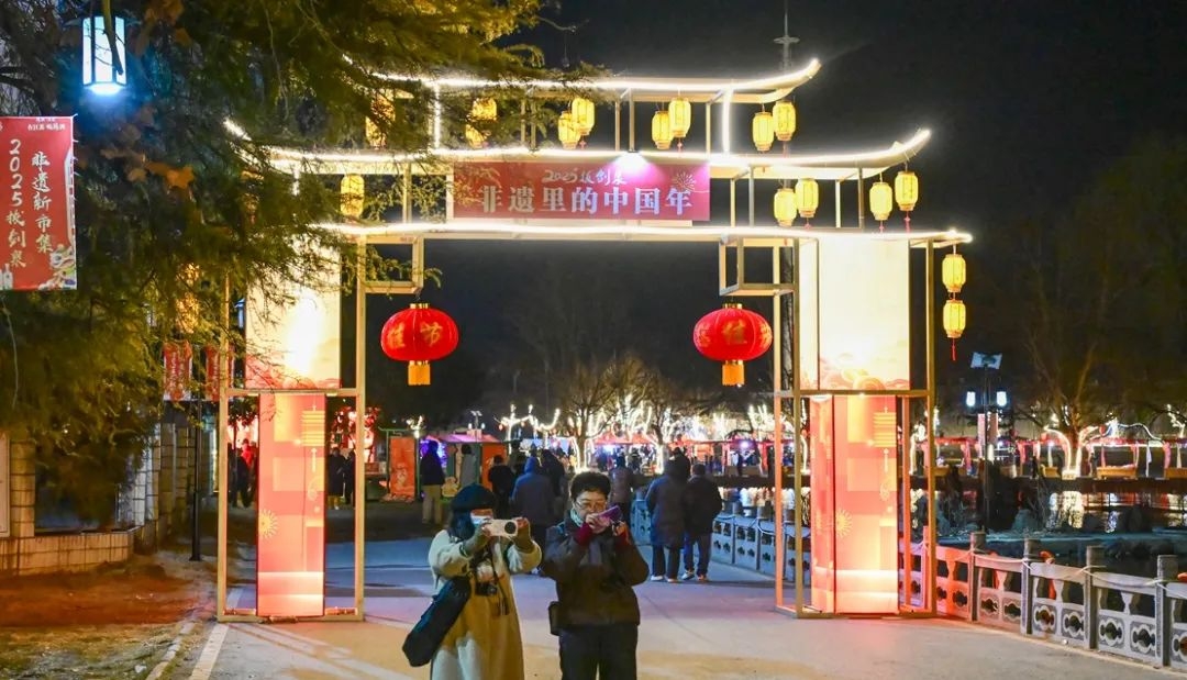 除了非遗表演,逛拔剑泉新市集也不要错过,走进集市,非遗手作、潮趣文创、年味美食……“热气腾腾”的摊位依次排开,玲琅满目的商品让人目不暇接,游客们纷纷踏足这片热闹之地,感受满满的烟火气和浓浓年味。