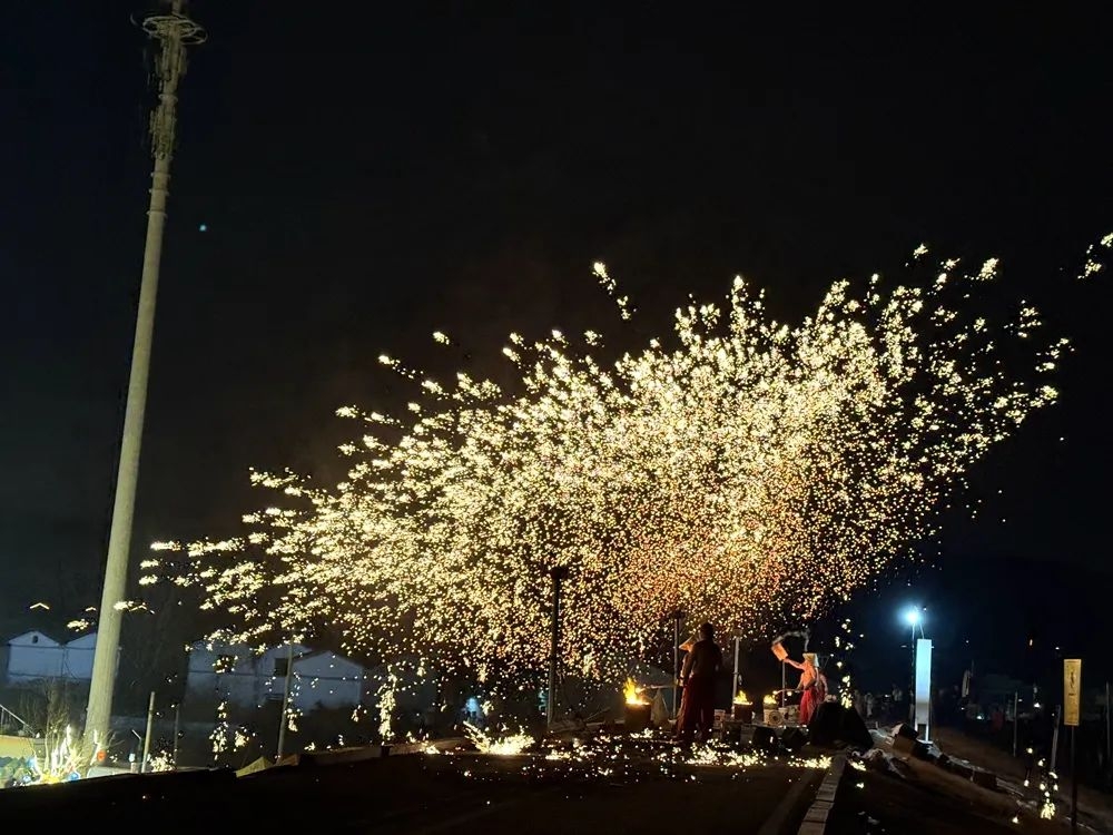 自大年初一(1月29日)开始,汉王镇开启了一场“水火华章·焰舞星河”的非遗大秀,“火树银花”绽放点亮夜空。夜色渐深,五彩的风火轮在飞速旋转,划出一道道绚丽的轨迹,随着“啪”的一声巨响,千余摄氏度高温的铁水被击打至空中后又渐渐坠落,四散成“火树银花”景象,引得游客阵阵欢呼。