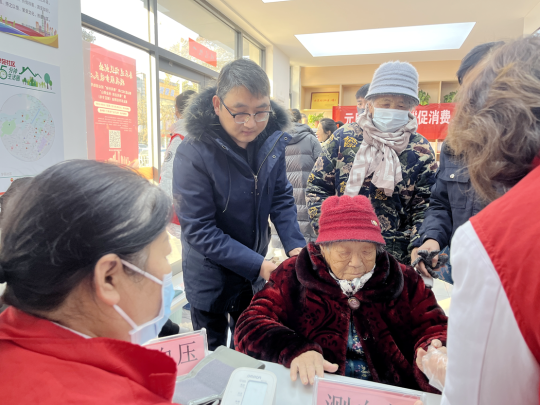 2月14日,学苑社区党委书记王大强联合铜山中医院开展健康义诊活动。