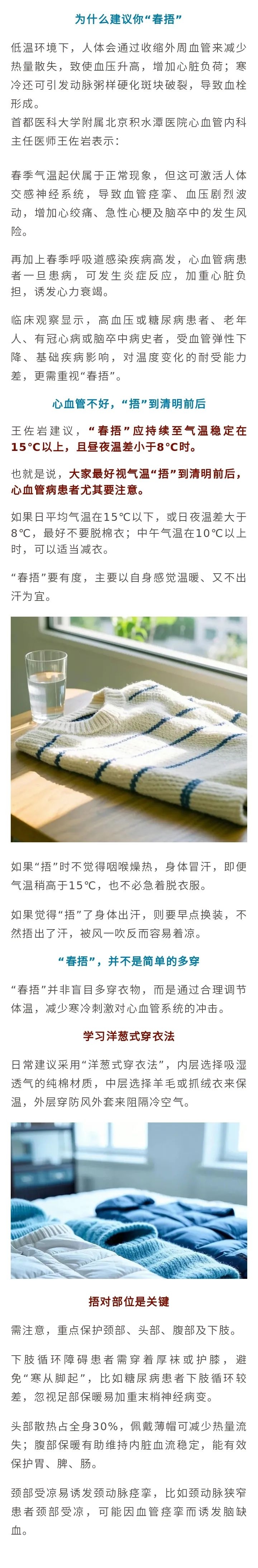 春季气温回暖,但早晚仍比较冷,昼夜温差明显,多地还可能遭遇“倒春寒”,容易让血管吃不消,增加心血管事件风险。