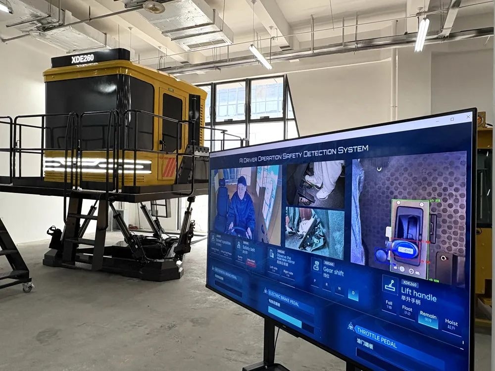 矿用自卸车操作训练模拟器装置吸引了记者的目光,试乘人员在车内模拟训练操作,配套显示屏上360°无死角呈现出驾乘人员的实时状况。公司研发中心产品总监晁磊向记者介绍:“该装置是公司自主研发的全新一代智能模拟培训装置,采用XDE260矿用卡车实车配件,具有多感互动、虚拟现实技术、六自由度运动平台技术、模块化设计等。在此基础上融入了AI人工智能,有效解决无法识别人在训练过程中操训行为的痛点,利用MR混合现实技术真正实现了实与虚的融合、人与机的融合、设备与培训课程融合,提高了操作技能培训的效能。”