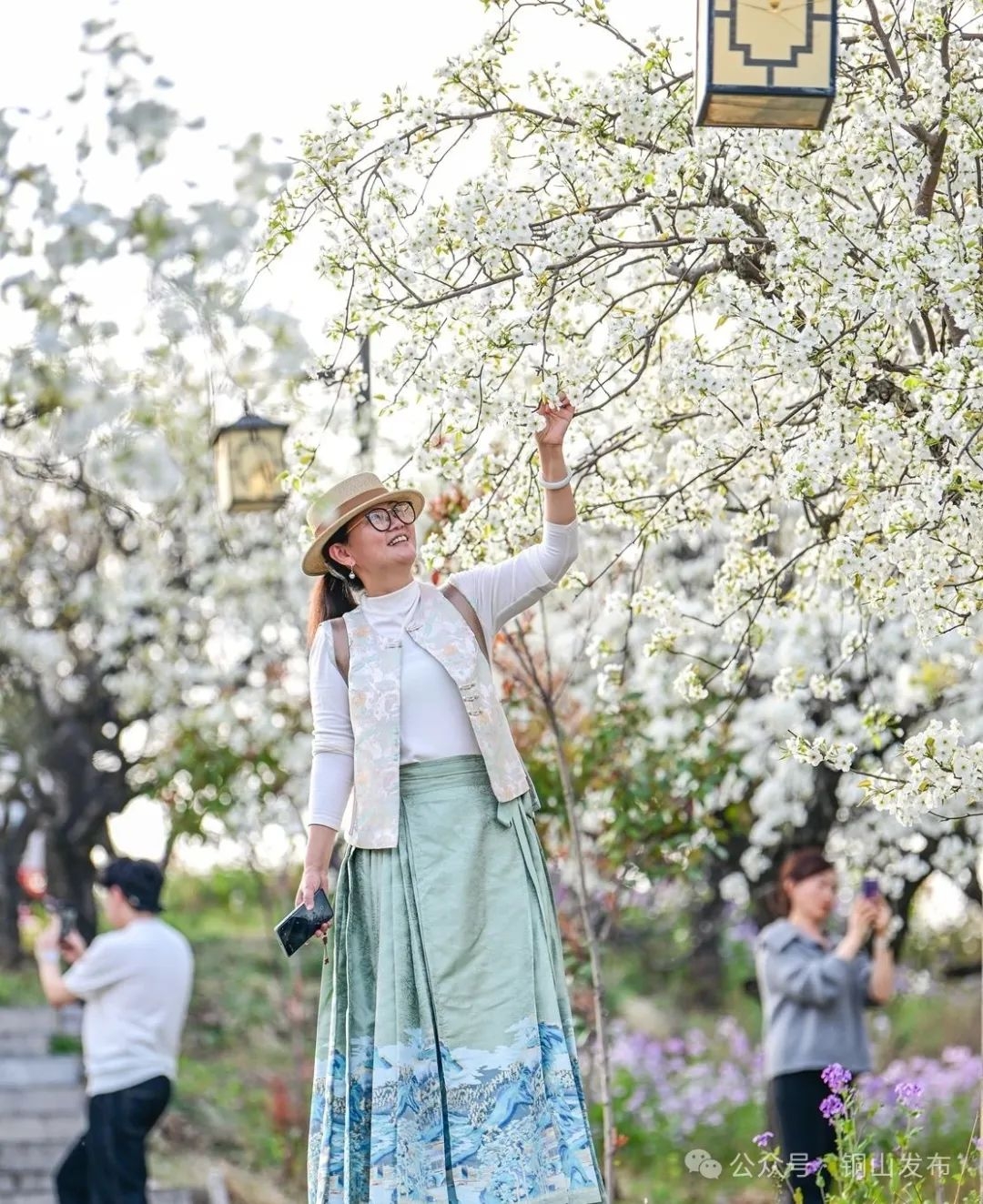 漫步梨花丛中,只见白色的花瓣妩媚动人,春风吹过,花枝摇曳,清香扑鼻。从远处看去,开满梨花的山野像是下了一场雪,景色十分壮观。