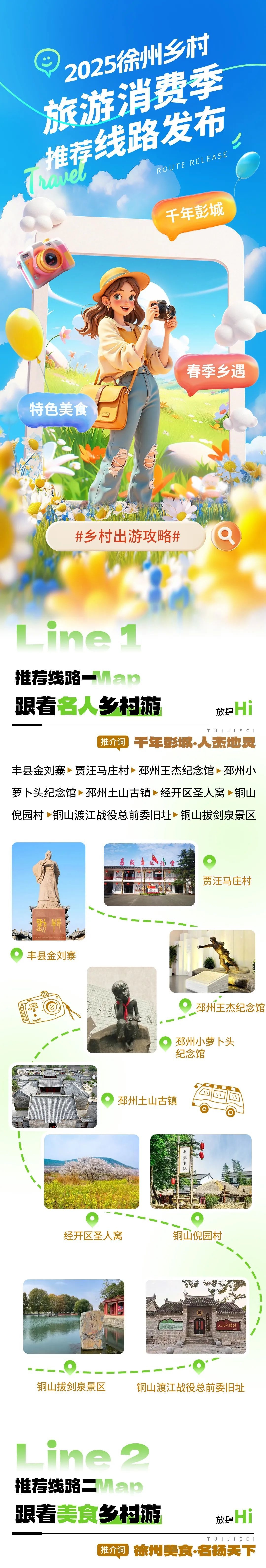 丰县瑶盛文化园→沛县安庄渔村→沛县稻香里乡村民宿→睢宁天鹅湖酒店→睢宁森鹿酒店→睢宁鲤鱼山庄民宿→新沂宋庄非遗民宿→铜山川上印象→铜山园博园涵田温泉度假村→贾汪山水间民宿→贾汪墨上集拾光影城民宿→贾汪一品潘安民宿