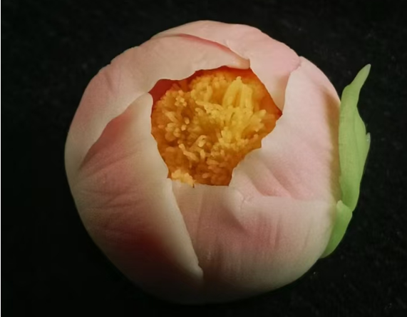 首先,准备一些粉色面团、白色面团、黄色面团、绿色面团和一团内馅。我先把粉色面团包入白色面团内揉圆、按平,再包入内馅,揉圆;接着,使用“木鸡蛋”在揉圆的面团上轻轻地按压出一个小窝;然后,使用三角棒把面团分成五等份,用大拇指和食指捏出花瓣的形状,用筛网把黄色面团制作出花蕊,再把花蕊放在中心处,用竹篦在捏好的花瓣上压出花瓣的纹理,收拢花型;最后,用绿色面团制作出叶片并贴在花朵上,一朵漂亮的牡丹花茶果子就做好了!