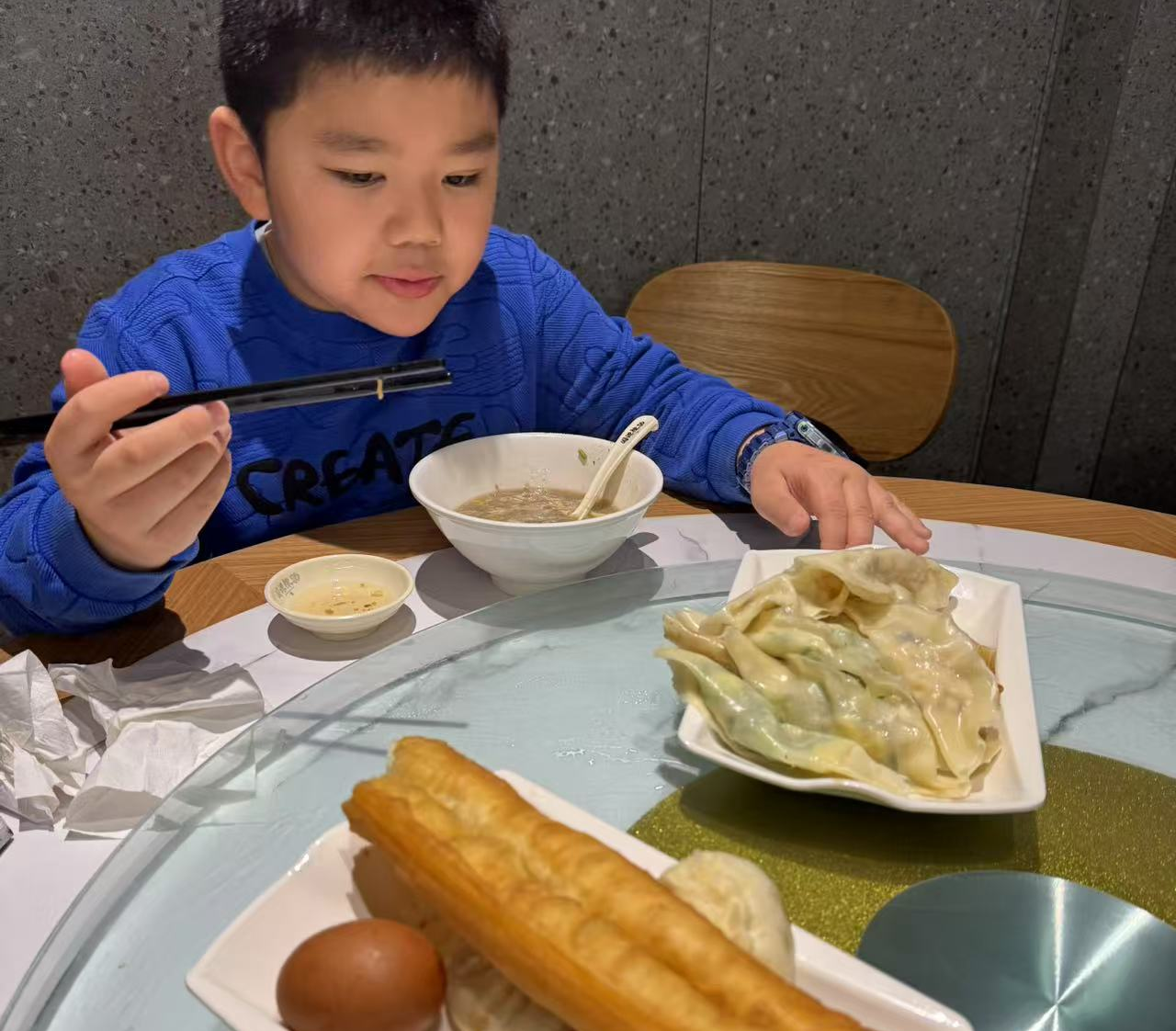 我们点的是加鸡蛋的辣汤、蒸包、油条和茶叶蛋,点完餐我和爸爸、妈妈就分别去排队领餐了。