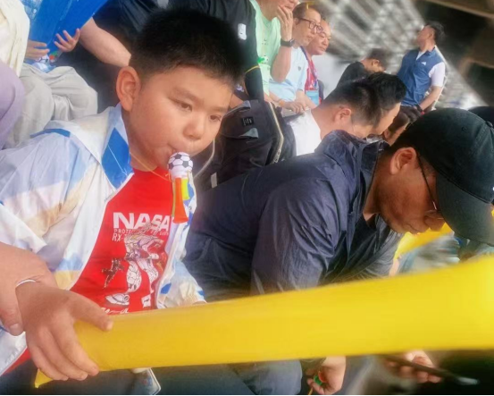 在比赛过程中,每当足球逼近连云港队的球门,我和现场的徐州球迷们都会紧张地站起来,心提到了嗓子眼,拼命喊着:“加油!加油!”爸爸作为资深球迷,一边目不转睛地盯着赛场,一边给我讲解足球知识。他告诉我什么是越位,怎么判断犯规,还教我看球员们的跑位和战术配合。我听得入了迷,原来小小的足球里藏着这么多学问!