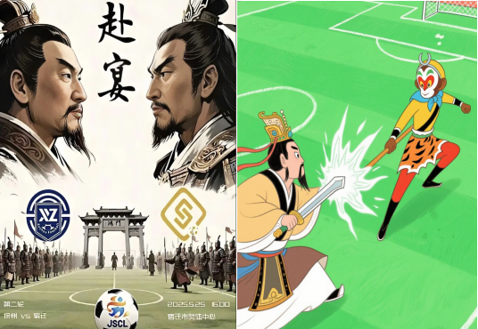 如徐州对阵宿迁,球迷称之为"楚汉之争",在看台上拉起有趣的巨大标语;与连云港的对决,则演变为"刘邦遇大圣"——徐州文旅推出刘邦执剑射门的海报,连云港以孙悟空蹴鞠动画回应,展开一场跨越千年的"云较量";与常州则变为"苏轼德比",常州球迷在看台上高唱"此心安处是吾乡",徐州球迷则用《江城子》韵律改编成助威歌,尽展文人风骨。