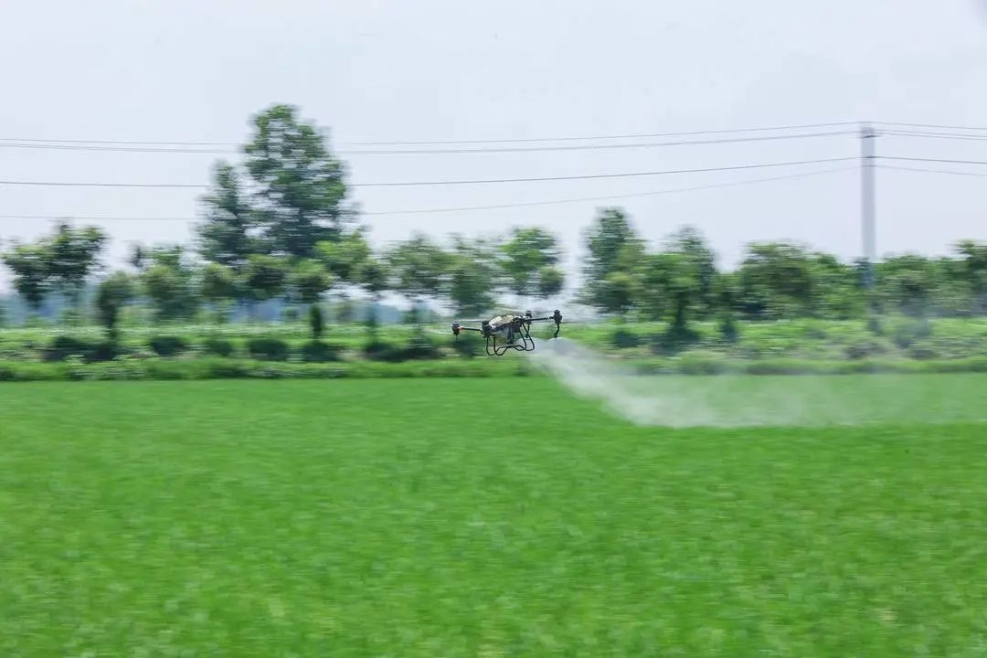 ▲无人机为水稻田进行喷洒农药,提高田间管理效率