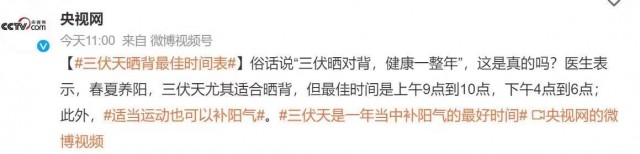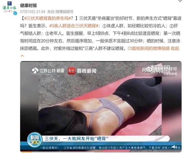 7月10日,南京医科大学二附院主管营养师梁婷婷表示,中医上讲,“三伏天晒背”有祛除体内寒湿气的功效。