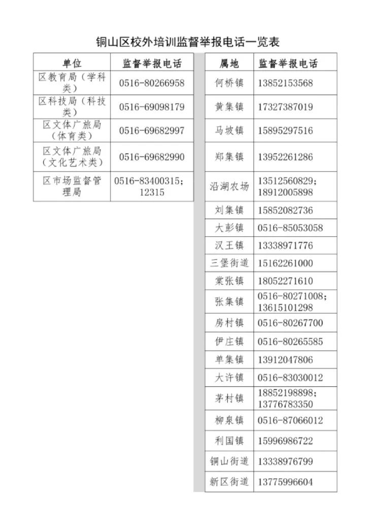 附件:铜山区校外培训监督举报电话一览表